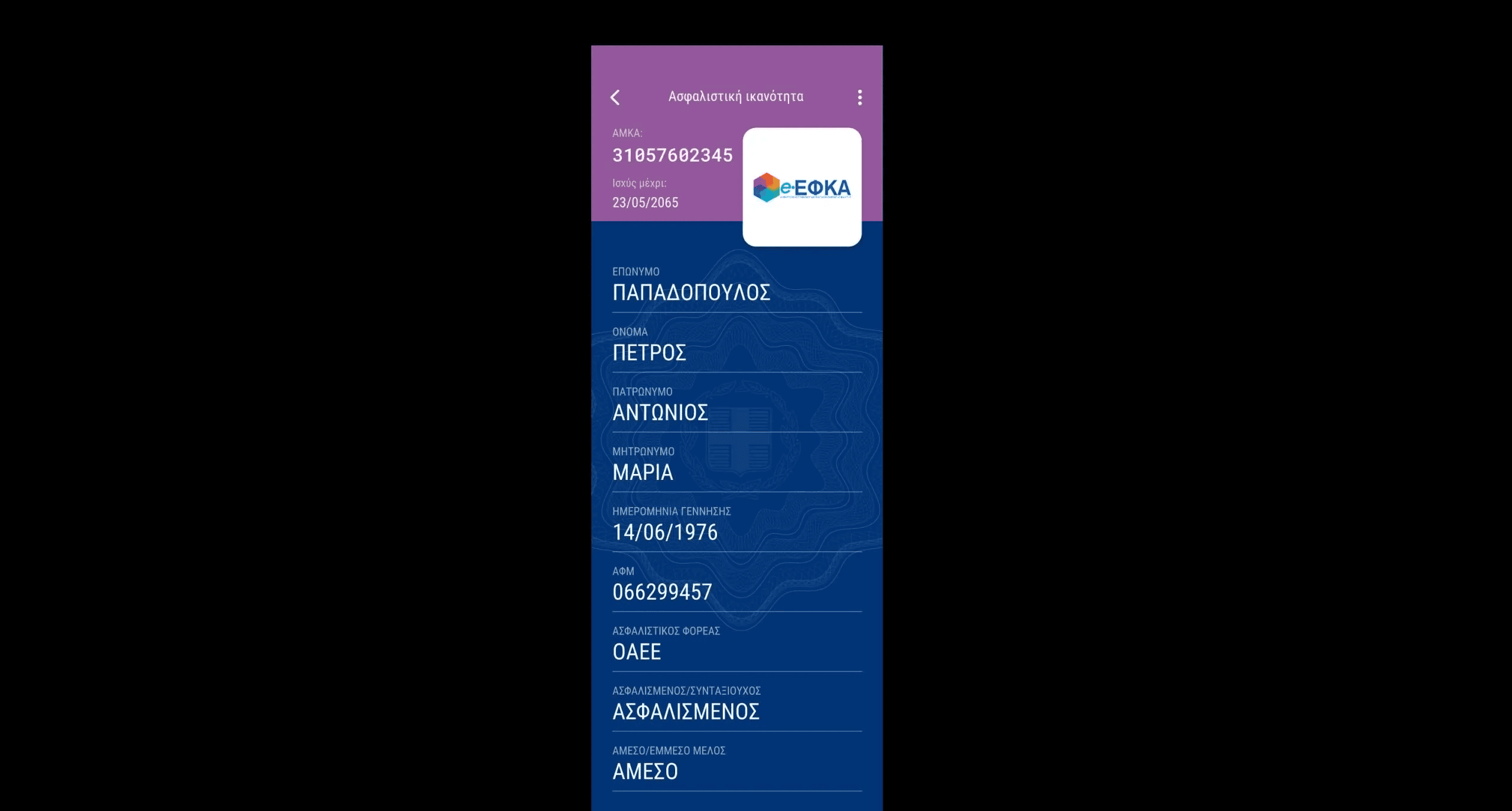 Με αυτόν τον τρόπο, οι ασφαλισμένοι του e-EΦΚΑ θα έχουν ανά πάσα στιγμή στη διάθεσή τους, μέσω του Gov.gr Wallet, την πληροφορία της ασφαλιστικής ικανότητας των ιδίων και των έμμεσων μελών που ασφαλίζονται από αυτούς, καθώς και την ημερομηνία λήξης αυτής, ώστε να προβαίνουν εγκαίρως στις απαραίτητες ενέργειες για την ανανέωσή της. Για κάθε ασφαλιστική ικανότητα που έχει προσθέσει ο χρήστης στην εφαρμογή λαμβάνει σχετική ειδοποίηση 8 ημέρες πριν τη λήξη της. Επιπλέον, ο πολίτης έχει πρόσβαση σε στοιχεία της ασφαλιστικής του κάλυψης, όπως ποιος είναι ο Ασφαλιστικός Φορέας και αν είναι άμεσο ή έμμεσο μέλος.