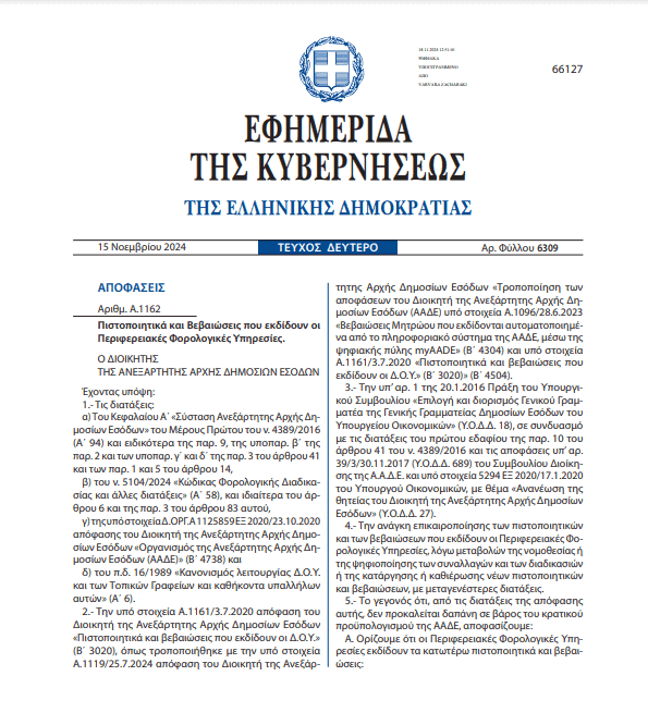 Αριθμ. Α. 1162 ΦΕΚ Β 6309 - 18.11.2024Πιστοποιητικά και Βεβαιώσεις που…