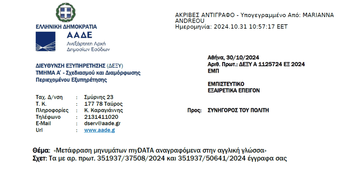ΑΑΔΕ: Θα προκαλούσε προβλήματα αν ηταν στα ελληνικά τα μηνύματα του mydata, λόγω διαφορετικής κωδικοποίησης ανά ERP